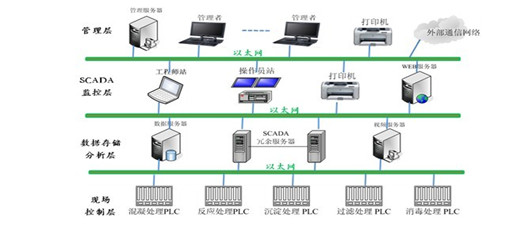 1、自動(dòng)化控制系統(tǒng)構(gòu)成 工業(yè)廢水處理的綜合自動(dòng)化監(jiān)控系統(tǒng)通常分為設(shè)備層、控制層及管理層三層結(jié)構(gòu)。管理層主要負(fù)責(zé)狀態(tài)監(jiān)控、數(shù)據(jù)采集、故障報(bào)警處理等工作?刂茖拥母鞴に嚟h(huán)節(jié)位置分散,位于中控室的控制中心將進(jìn)行統(tǒng)一監(jiān)控。